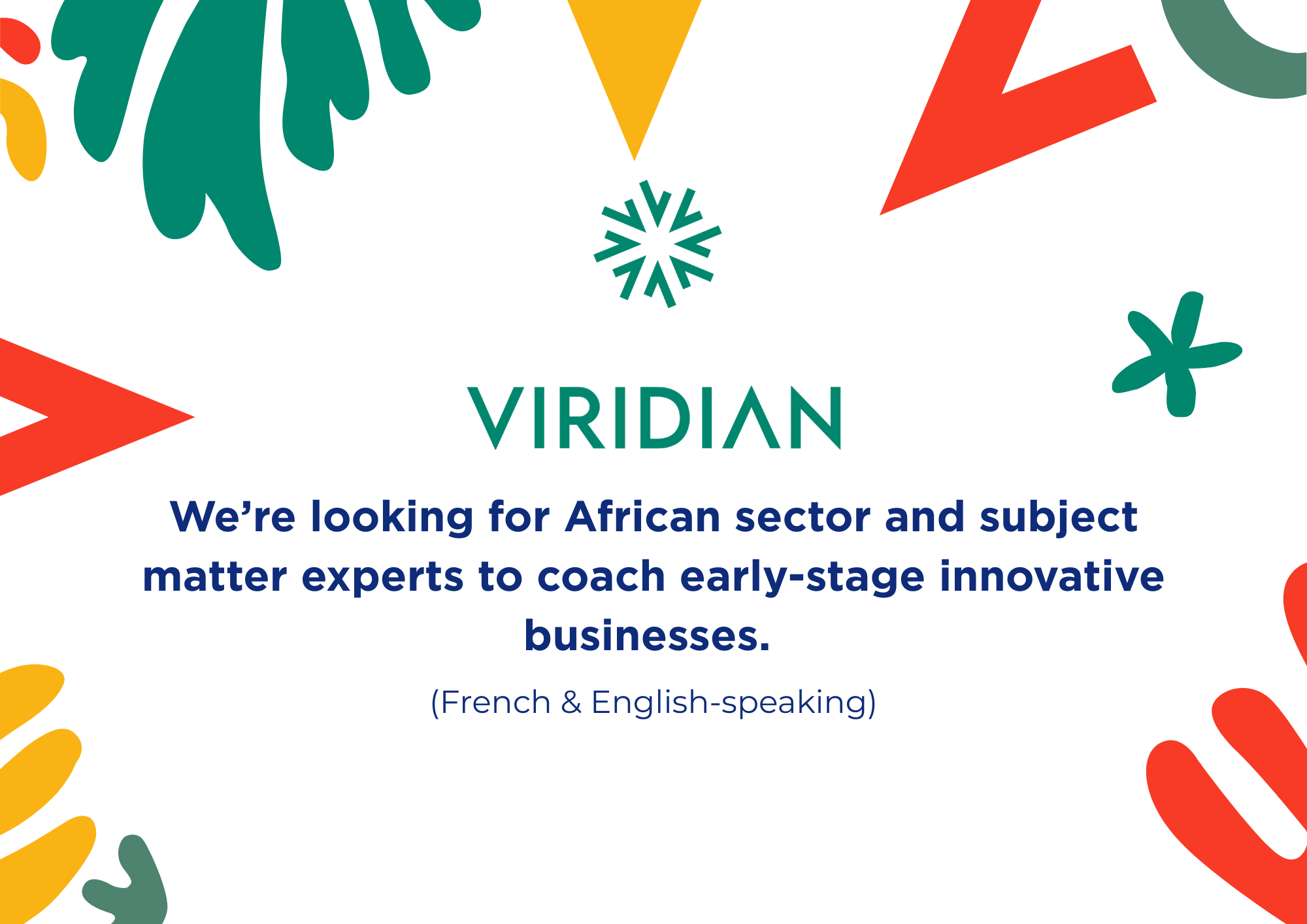 ๐ช๐ฒ’๐ฟ๐ฒ ๐น๐ผ๐ผ๐ธ๐ถ๐ป๐ด ๐ณ๐ผ๐ฟ ๐ณ๐ผ๐ฟ ๐๐ณ๐ฟ๐ถ๐ฐ๐ฎ๐ป ๐๐ฒ๐ฐ๐๐ผ๐ฟ ๐ฎ๐ป๐ฑ ๐๐๐ฏ๐ท๐ฒ๐ฐ๐ ๐บ๐ฎ๐๐๐ฒ๐ฟ ๐ฒ๐ ๐ฝ๐ฒ๐ฟ๐๐ ๐๐ผ ๐ฐ๐ผ๐ฎ๐ฐ๐ต ๐ฒ๐ฎ๐ฟ๐น๐-๐๐๐ฎ๐ด๐ฒ ๐ถ๐ป๐ป๐ผ๐๐ฎ๐๐ถ๐๐ฒ ๐ฏ๐๐๐ถ๐ป๐ฒ๐๐๐ฒ๐ (๐๐ฟ๐ฒ๐ป๐ฐ๐ต ๐ฎ๐ป๐ฑ ๐๐ป๐ด๐น๐ถ๐๐ต ๐๐ฝ๐ฒ๐ฎ๐ธ๐ถ๐ป๐ด). Viridian designs and delivers programmes for Pan-African